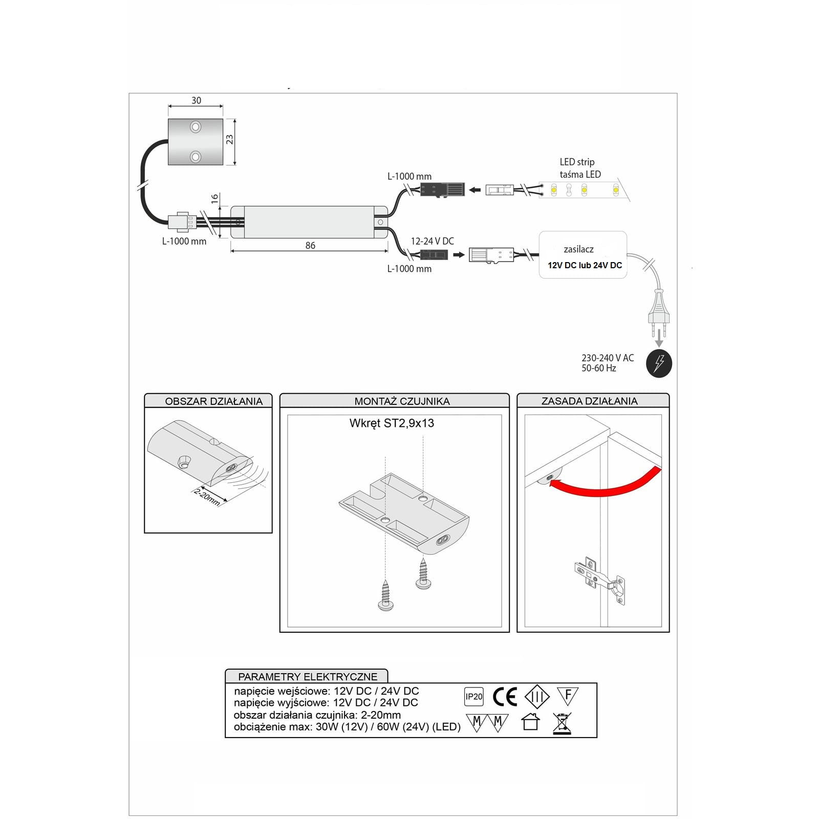 | Zasięg działania czujnika IR | 2-20 mm (zalezne od rodzaju frontu meblowego) |