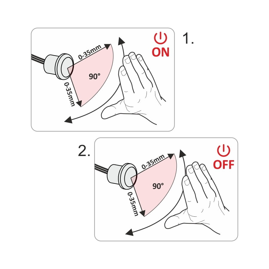Załączanie oświetlenia następuje poprzez ruch-zbliżenie dłoni w obrębie czujnika-sensora na odległości 3-6 cm.