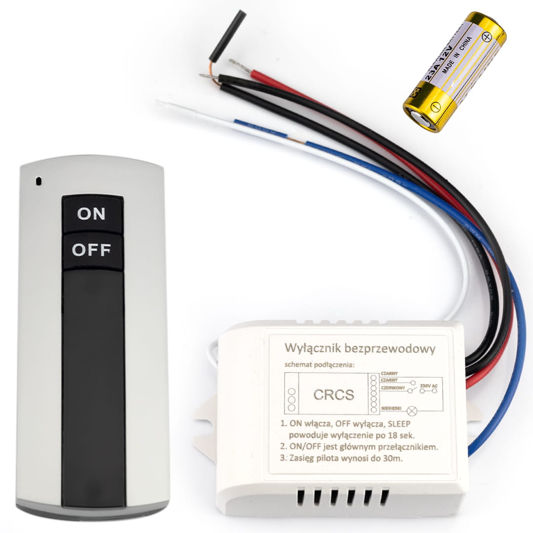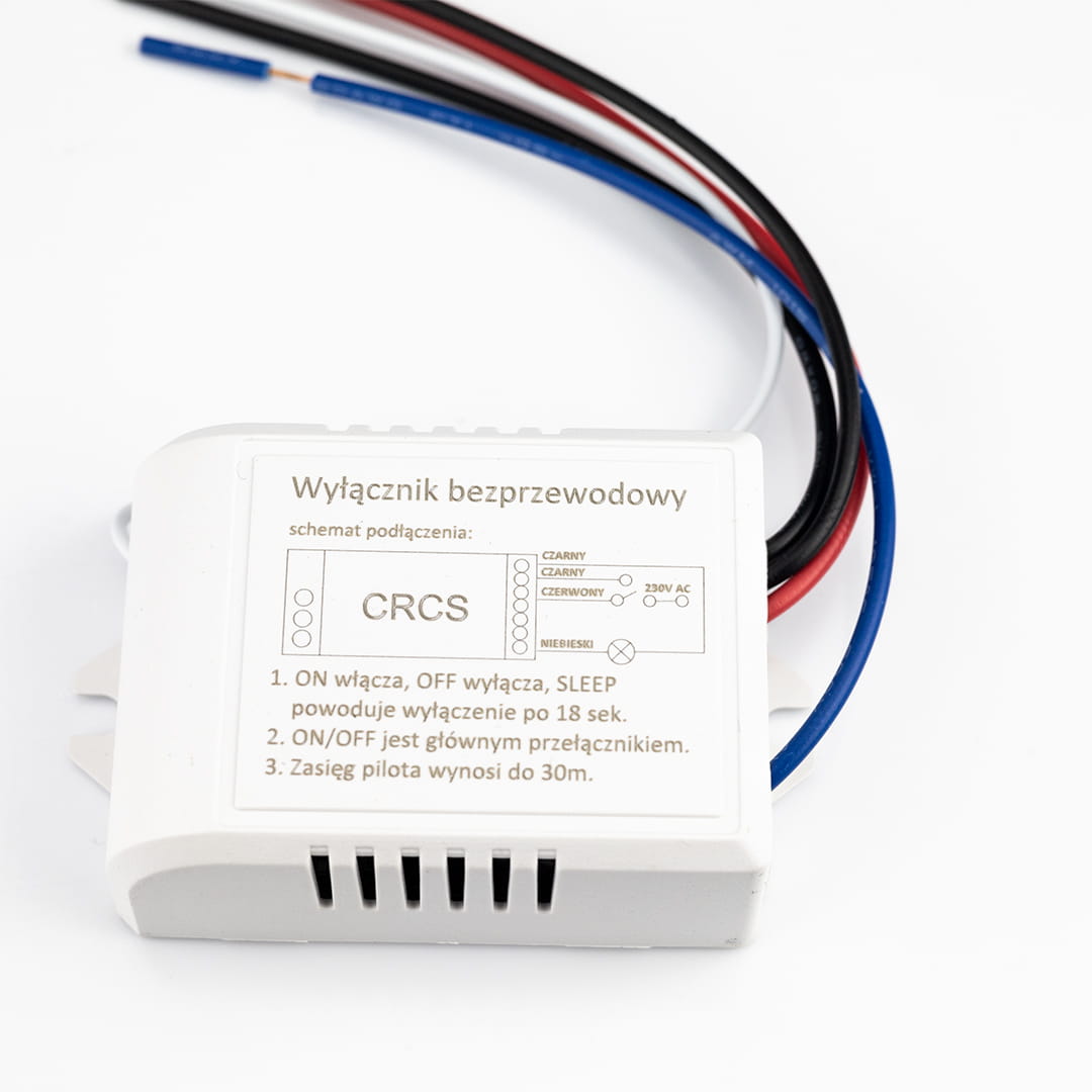 Bezprzewodowy jednokanałowy wyłącznik urządzeń o napięciu zasilania 230V np. oświetlenia. Doskonale sprawdzi się w sterowaniu oświetleniem LED zamontowany przed zasilaczem DC. Łatwy w podłączeniu - dwa przewody to wejście zasilania 230V i następne dwa to wyjście zasilania po przekazniku uruchamianym radiowym pilotem o zasięgi 20 do 30m. Pilot zasilany baterią 23A 12V - w zestawie.