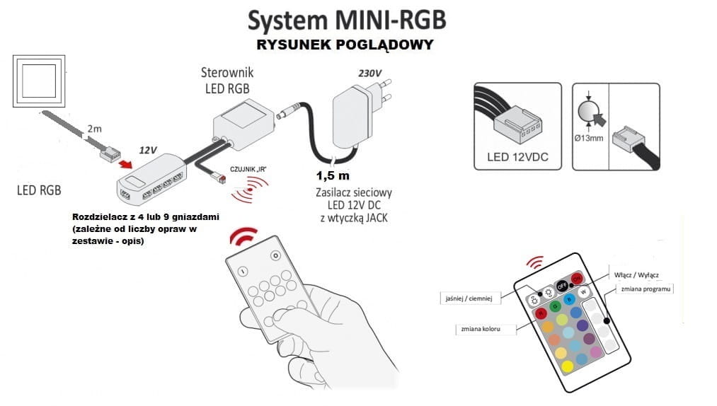 Zestaw wyposażony w układ zasilania składający się : sterownika RGB z pilotem
