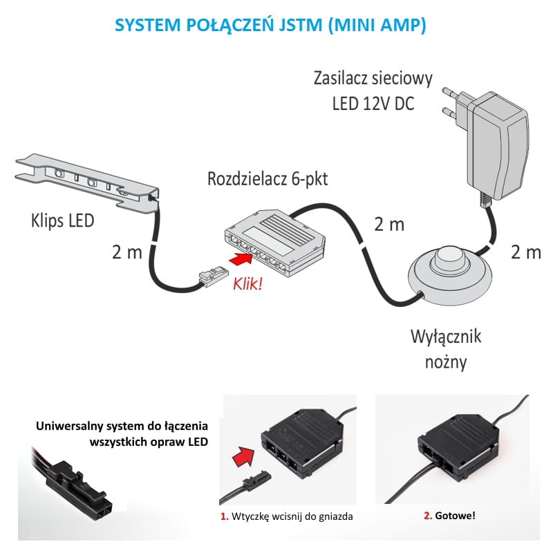 Oferowane przez nas klipsy są wyposażone w 2 m przewodu zasilającego zakończonego micro wtykiem .