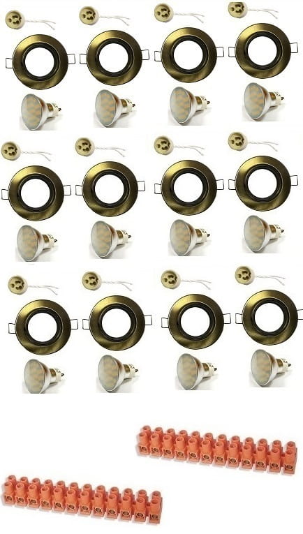 ZESTAW 12 SZT OPRAWEK SUFITOWYCH WPUSZCZANYCH KOLORU MOSIĄDZ Z ŻARÓWKAMI LED GU10 230V 5W O BARWIE ŚWIATŁA BIAŁEJ CIEPŁEJ ORAZ LISTWAMI ZACISKOWYMI DO PODŁĄCZENIA DO INSTALACJI ELEKTRYCZNEJ. OPRAWKI W ZESTAWIE Z MOŻLIWOŚCIĄ REGULACJI KIERUNKU STRUMIENIA ŚWIETLNEGO .