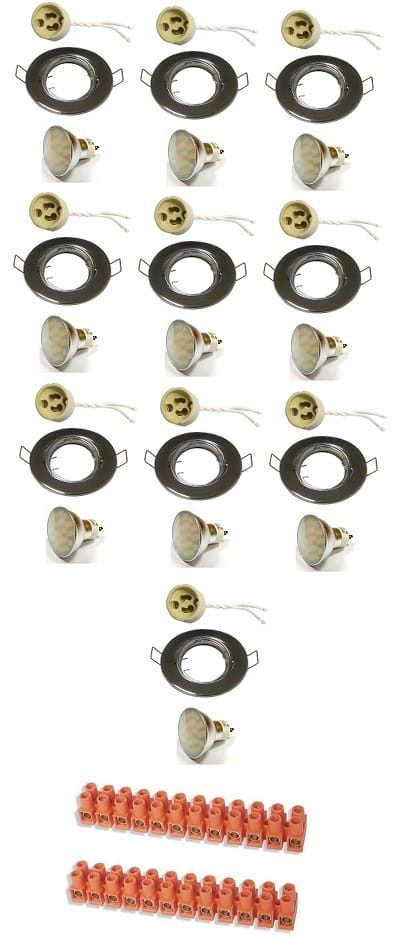ZESTAW 10 SZT OPRAWEK SUFITOWYCH WPUSZCZANYCH KOLORU CHROM Z ŻARÓWKAMI LED GU10 230V 5W O BARWIE ŚWIATŁA BIAŁEJ CIEPŁEJ ORAZ LISTWAMI ZACISKOWYMI DO PODŁĄCZENIA DO INSTALACJI ELEKTRYCZNEJ. OPRAWKI W ZESTAWIE Z MOŻLIWOŚCIĄ REGULACJI KIERUNKU STRUMIENIA ŚWIETLNEGO .