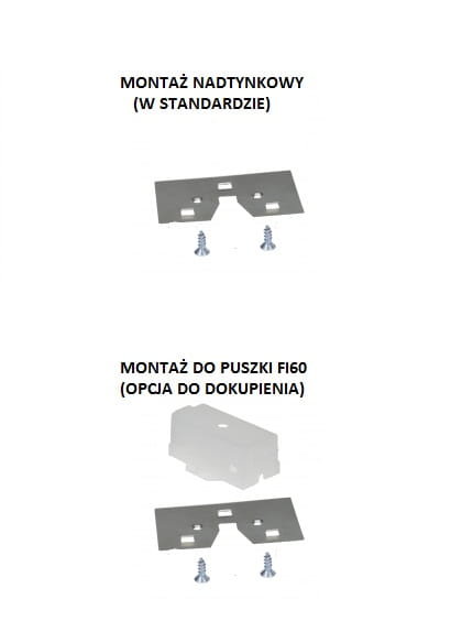 | Montaż oprawy | Natynkowo (w standardzie) lub w puszce instalacyjnej fi60 (opcja dodatkowa ) |