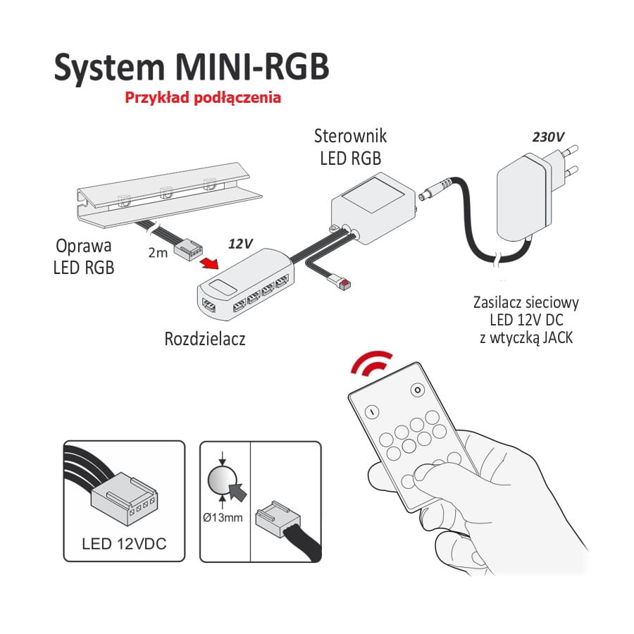 Mozliwość połączenia dowolnej liczby opraw w kompletny gotowy zestaw w połączeniu z sterownikiem RGB na pilota z możliwością ustawienia jasności świecenia opraw
