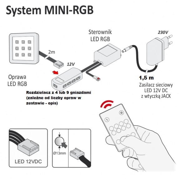 Oprawa wyposażona w przewód podłączeniowy płaski wielokolorowy zakończony czteropinowym wtykiem mini AMP pasującym do rozdzielaczy rgb dostępnych w naszym sklepie o długości 200 cm oraz otwory montażowe w obudowie jest łatwa do zamontowania i podłączenia .