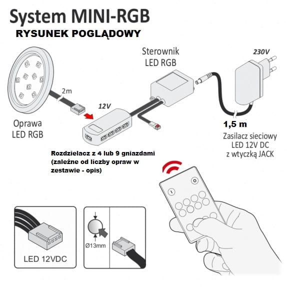 Oprawa wyposażona w przewód podłączeniowy płaski wielokolorowy zakończony czteropinowym wtykiem mini AMP pasującym do rozdzielaczy rgb dostępnych w naszym sklepie o długości 200 cm oraz otwory montażowe w obudowie jest łatwa do zamontowania i podłączenia .