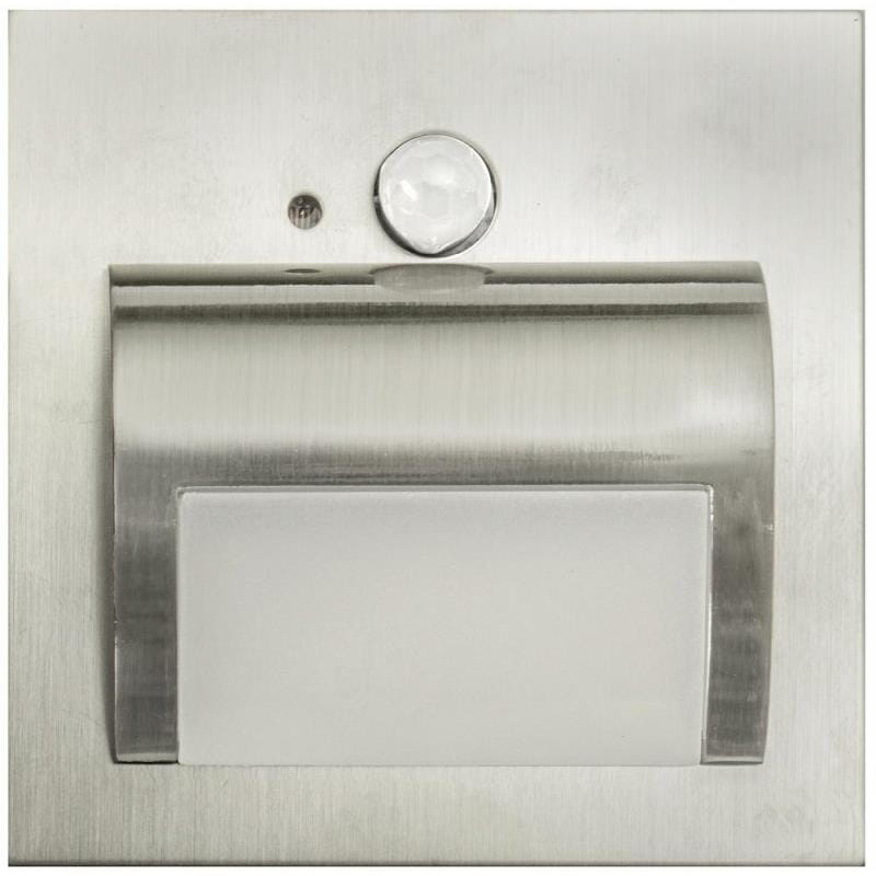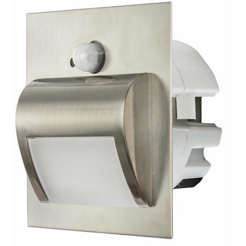 Oprawa LED z wbudowanym czujnikiem ruchu PIR wykonana z metalu kolor satyna o nowoczesnym wyglądzie przeznaczona do oświetlenia schodów, ciągów komunikacyjnych, holi.
