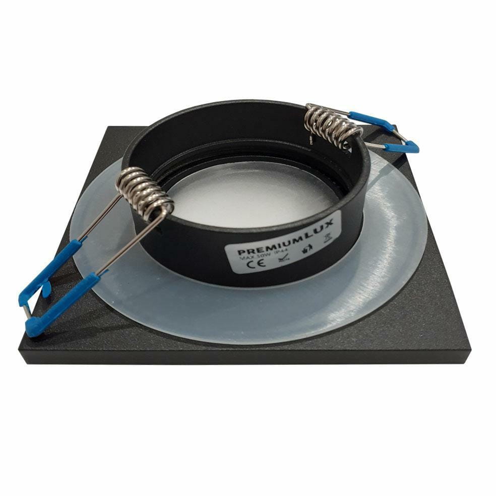 Kwadratowa oprawa sufitowa w kolorze czarnym ze szkłem zabezpieczającym zarówkę oraz pierścieniem gumowym przeznaczona do zastosowania w warunkach o podwyrzszonym stopniu wilgotności. Oprawka wykonana z aluminium malowana na proszkowo o estetycznym wykonaniu do zastosowania z zarówkami o średnicy 50 mm i napięciu zasilania 12-230V. Gniazdo żarówki GU10 lub MR16 do dokupienia osobno w naszym sklepie .