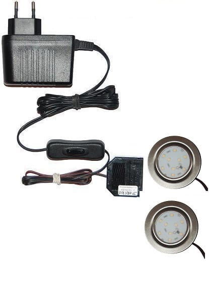 Gotowy kompletny połączony zestaw z dwoma oprawami LED w komplecie dla oświetlenia, podświetlenia mebli,witryn,gablot,regałów, itp. Zestaw wyposażony w układ zasilania z wyłącznikiem na kablu o długości 150 cm, rozdzielacza DC do którego za pomocą mikro wtyków typu JSTM są podłączone oprawy LED z długością przewodu 200 cm zakończony micro wtyczką typu JSTM.