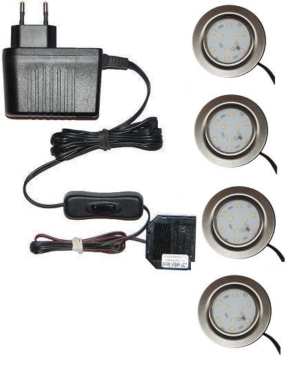 Gotowy kompletny połączony zestaw z czteroma oprawami LED w komplecie dla oświetlenia, podświetlenia mebli,witryn,gablot,regałów, itp. Zestaw wyposażony w układ zasilania z wyłącznikiem na kablu o długości 150 cm, rozdzielacza DC do którego za pomocą mikro wtyków typu JSTM są podłączone oprawy LED z długością przewodu 200 cm zakończony micro wtyczką typu JSTM.