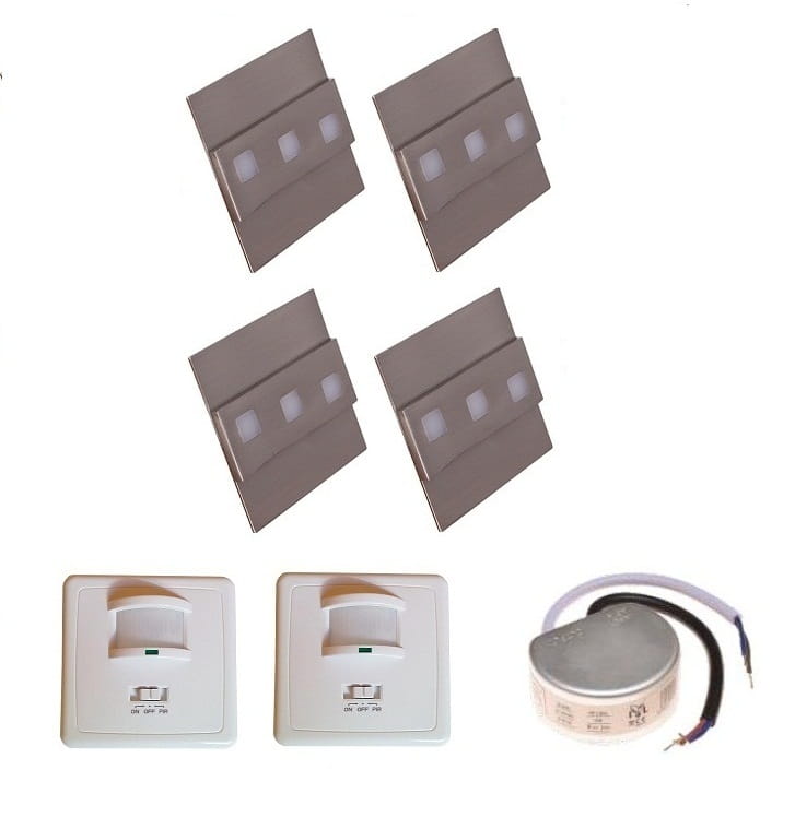 Zestaw oświetlenia schodów z czujnikami ruchu i zasilaczem . Komplet 4 opraw oświetlenia schodowego MODESTO dostępne w kolorach : satyna,mosiądz,biały,grafit,czarny z barwą światła do wyboru ciepła lub zimna o mocy 1,2W i napięciu zasilania 12V DC .Oprawy przystosowane do montażu w puszce fi60 lub natynkowo (uchwyt do montażu w puszce fi60 oraz do montażu natynkowego w komplecie) Czujniki ruchu do automatycznego załączania oświetlenia schodów w momencie wykrycia ruchu na schodach montowane na początku i końcu schodów. Regulacja natężenia światła przy jakim oświetlenie schodów po wykryciu ruchu ma się załączyć ,czasu świecenia jak również możliwość ustawienia trzech trybów pracy :automatyczny,załączony,wyłączony. Montaż czujnika w standartowej puszce instalacyjnej fi60 na wysokości od 15cm do 150 cm.