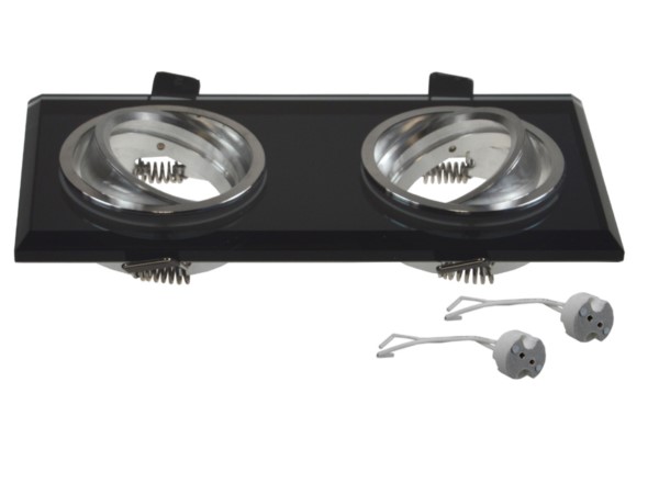 Oprawa sufitowa szklana podwójna regulowana koloru czarnego wykonana ze szkła i aluminium przeznaczona do wszelkiego rodzaju sufitów podwieszanych. Dzięki zastosowaniu klipsów mocujących oprawa łatwa w montażu, przystosowana do zastosowania dwóch zródeł światła najlepiej LED o średnicy żarówki 50mm z gwintem GU10 lub MR16. Gniazdo żarówki GU10 do dokupienia w zakładce akcesoria. Z powodzeniem można do niej stosować najbardziej popularne żarówki o średnicy 50 mm z trzonkiem GU10 230V lub G5,3 12V. Zasilanie bezpośrednio z sieci napięciem 230V eliminuje konieczność montowania zasilaczy, więc można ją swobodnie stosować do instalacji 230V. Niewątpliwą zaletą jest zastosowanie przez producenta zamiast drucika przytrzymującego żarówkę ozdobnego wkręcanego pierścienia, który umożliwia szybką wymianę żarówki oraz nadaje oprawce dużo bardziej atrakcyjnego wyglądu.