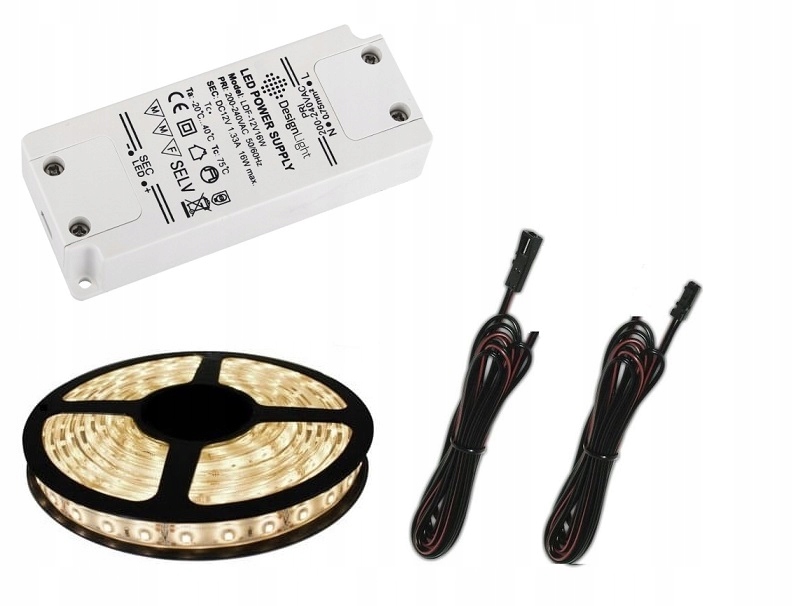 Gotowy zestaw składający się z taśmy LED wewnętrznej z barwą światła białą ciepłą o długości 2 m oraz zasilacza meblowego 12V DC z i przewodów łączących taśmę z zasilaczem DC.Taśma LED wysokiej jakości diody pozbawione efektu mrugania świecą czystym światłem nie męcząc wzrok. Wyposażona w taśmę klejącą/montażową łatwo można ją zamocować .Zasilacz LED meblowy wyposażony po stronie zasilania 230V i po stronie wyjścia napięcia DC 12V zaciskami podłączeniowymi W komplecie dwa przewody o długości 1m z dla łatwego połączenia zasilacza z taśmą . Taśma poprzez przewody podłączeniowe podłączona do zasilacza . Długość przewodu pomiędzy zasilaczem a taśmą LED 2m.. Napięcie zasilania 230V podłączane bezpośrednio do zacisków zasilacza.