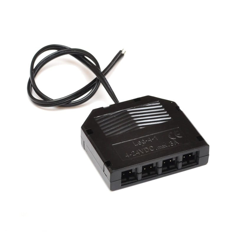 Rozdzielacz posiada 4 sztuki micro gniazd typu JSTM oraz przewód podłączeniowy do zasilania 12V lub 24V.