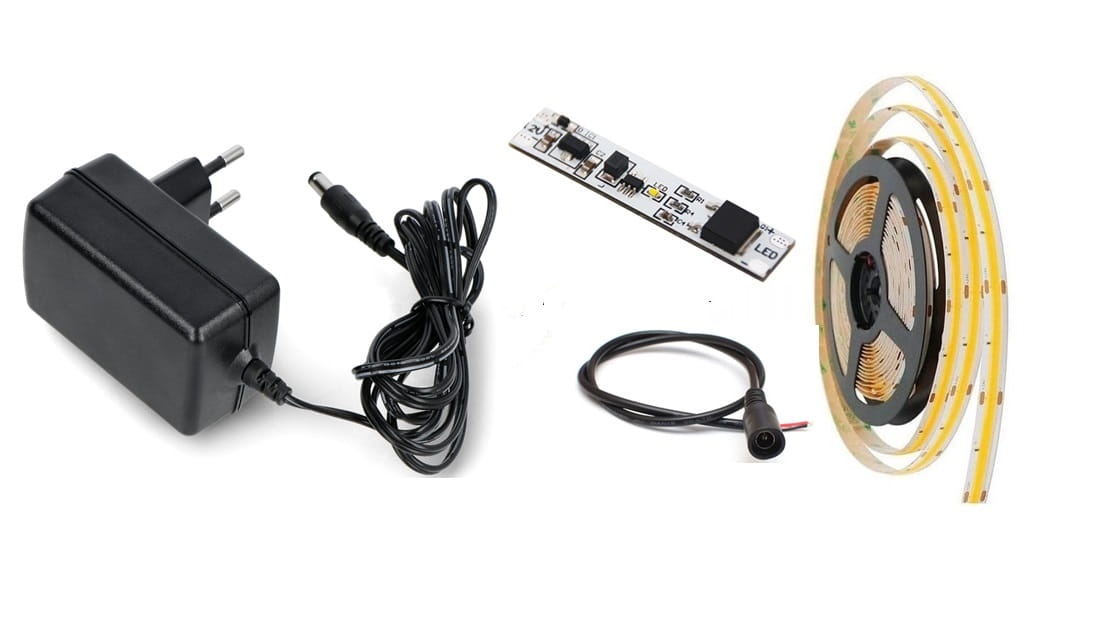 Gotowy zestaw składający się z taśmy LED COB wewnętrznej z barwą światła białą neutralną o długości 2 m z przylutowanym wyłącznikiem dotykowym profilowym oraz zasilacza gniazdkowego 12V DC i gniazda DC 2,1/5,5 łączącego taśmę i wyłącznik z zasilaczem DC. Taśma LED COB to nowoczesny pasek LED wysokiej jakości, diody o bardzo dużym zagęszczeniu na metr taśmy dające efekt ciągłej linii światła , pozbawione efektu mrugania świecą czystym światłem nie męcząc wzrok. Wyposażona w taśmę klejącą/montażową łatwo można ją zamocować .Wyłącznik profilowy dotykowy z delikatnym podświetleniem miejsca dotyku (załączenia/wyłączenia) . Umieszczony razem z taśmą COB w profilu LED i przysłonięty kloszem sprawdzi się jako wygodny sposób załączenia i wyłączenia oświetlenia poprzez krótki dotyk miejsca podświetlenia na wyłączniku . Ponowny dotyk tego miejsca wyłączy nam oświetlenie. Zasilacz LED typu gniazdkowy zakończony po stronie zasilania wtyczką 230V natomiast po stronie wyjścia napięcia DC 12V wtykiem DC 2,1/5,5W komplecie gniazdo DC dla łatwego połączenia zasilacza z wyłącznikiem i taśmą .Długość przewodu od zasilacza do taśmy LED ok 100 cm. Zestaw gotowy polutowany połączony i sprawdzony . Wystarczy włączyć zasilacz do gniazda 230V i gotowe ! Zasilacz w zestawie może się w rzeczywistości nieco różnić kształtem i wymiarami od prezentowanego w ofercie - zależne od dostawy.
