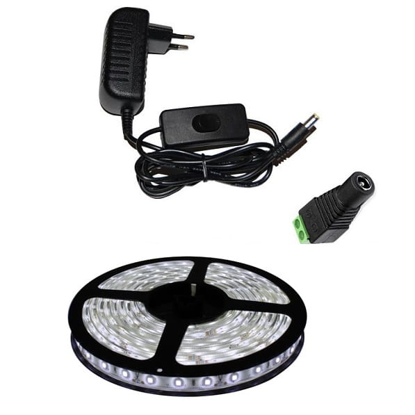 Gotowy zestaw składający się z taśmy LED wewnętrznej z barwą światła białą zimną o długości 2 m oraz zasilacza gniazdkowego 12V DC z wyłącznikiem klawiszowym zamontowanym na przewodzie i gniazda DC 2,1/5,5 łączącego taśmę z zasilaczem DC. Taśma LED wysokiej jakości diody o zagęszczeniu 120 szt na metr taśmy , pozbawione efektu mrugania świecą czystym światłem nie męcząc wzrok. Wyposażona w taśmę klejącą/montażową łatwo można ją zamocować .Zasilacz LED typu gniazdkowy zakończony po stronie zasilania wtyczką 230V natomiast po stronie wyjścia napięcia DC 12V wtykiem DC 2,1/5,5W komplecie gniazdo DC dla łatwego połączenia zasilacza z taśmą .Długość przewodu od zasilacza do taśmy LED ok 100 cm.