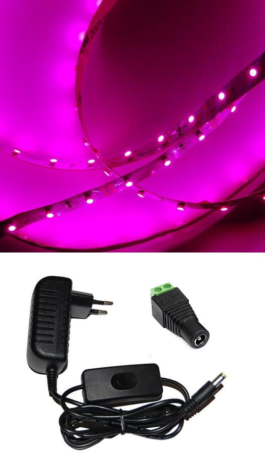 Gotowy zestaw składający się z taśmy LED barwa fioletowa o długości 5 m oraz zasilacza gniazdkowego 12V DC o mocy 24W z wyłącznikiem klawiszowym zamontowanym na przewodzie i gniazda DC 2,1/5,5 łączącego taśmę z zasilaczem DC.