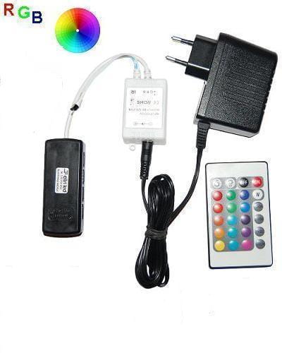 Gotowy układ zasilania oświetlenia LED RGB (wielokolorowe) zasilacz, sterownik i rozdzielaczem DC z czteroma gniazdami do podłączenia oświetlenia LED RGB - ,klipsy i oprawy meblowe wielokolorowe (RGB). Zestaw składa się z zasilacza gniazdkowego o mocy 12W 230V/12V DC sterownika RGB z pilotem ,rozdzielacza DC z dziewięcioma micro gniazdami oraz przewodów łączących .Układ gotowy i sprawdzony do użycia. Sumaryczna moc podłączonych odbiorników LED nie może być większa od mocy zasilacza w układzie.