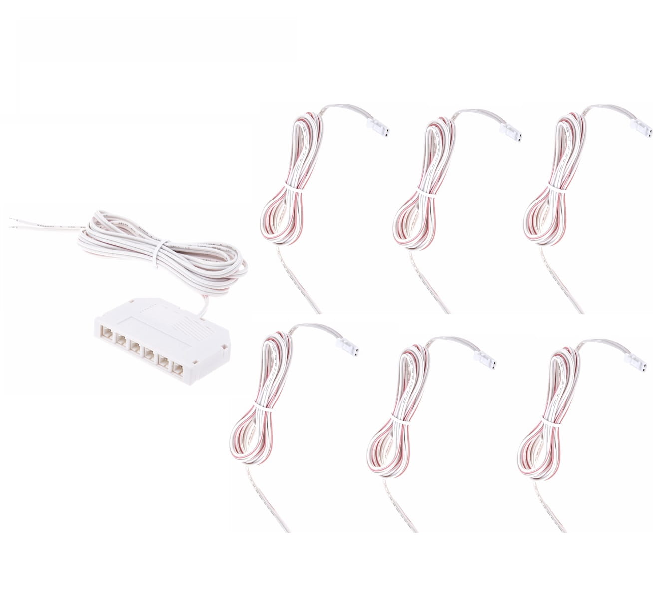 Zestaw do podłączenia odbiorników LED np taśma LED, oprawy meblowe, wyłączniki z zasilaczem. Komplet składa się z rozdzielacza JSTM (mini AMP) oraz 6 szt przewodów podłączeniowych . Rozdzielacz posiada 6 szt wejść- gniazd oraz przewód o długości ok 200 cm . Przewody podłączeniowe o przekroju 2X0,22 i długości 2m każdy zakończone wtyczką JSTM (mini AMP). Kolor rozdzielacza i przewodów biały.
