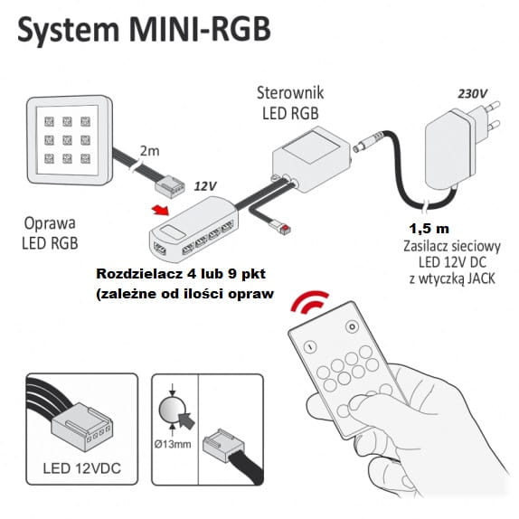 Zestaw składa się z zasilacza gniazdkowego o mocy dopasowanej do ilości opraw w zestawie opraw RGB ,rozdzielacza DC do którego za pomocą mikro wtyków są podłączone oprawy LED z długością przewodu 200 cm oraz sterownika RGB z pilotem IR za pomocą którego zestaw można załączyć/wyłączyć,zmieniać kolory,ściemnić/rozjaśnić ,właczyć tryby dynamiczne. .Oprawa LED ORBIT w zestawie - kwadratowa o mocy 2W każda, wykonana z tworzywa, obudowa o grubości zaledwie 6 mm mocowana nawierzchniowo