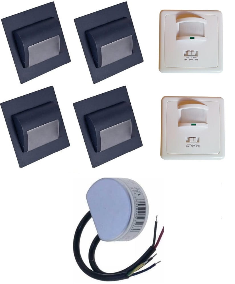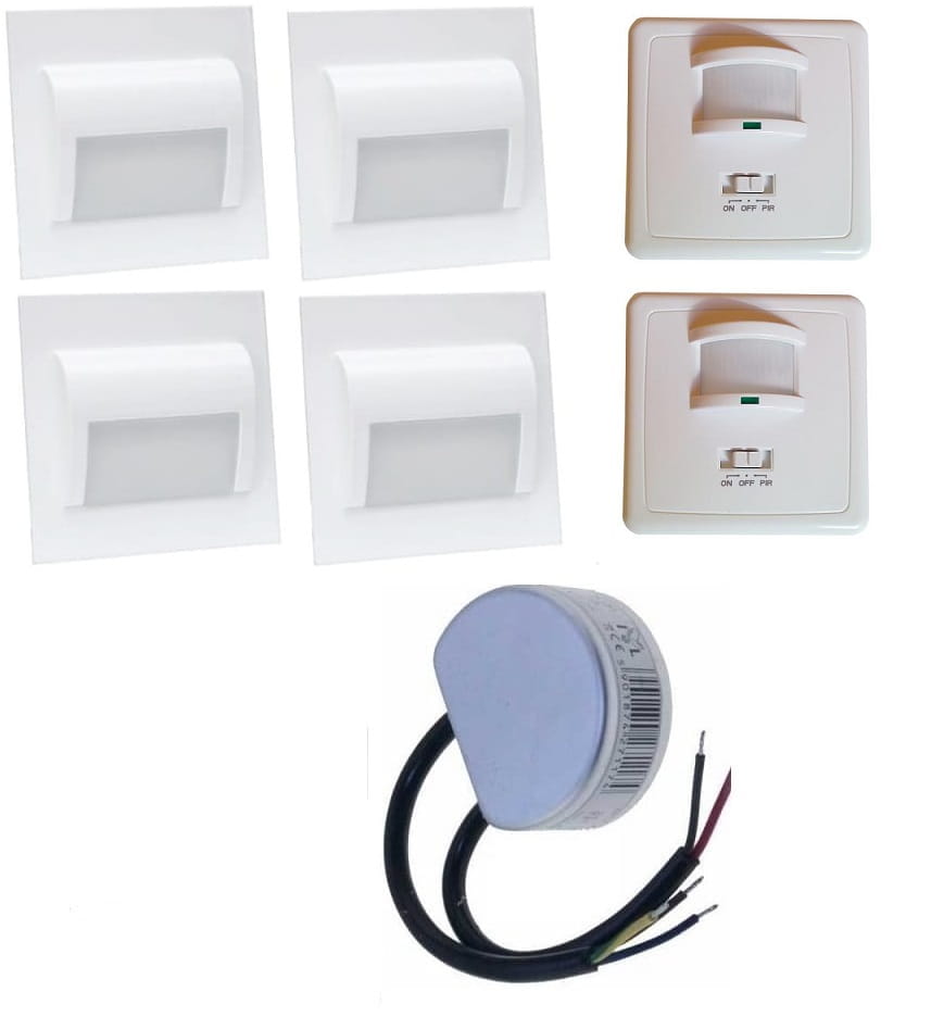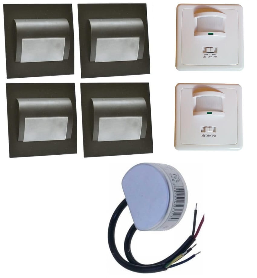 Zestaw do podświetlenia-oświetlenia schodów składający się z 4 sztuk opraw ,zasilacza 12V DC 10W oraz dwóch czujników ruchu .